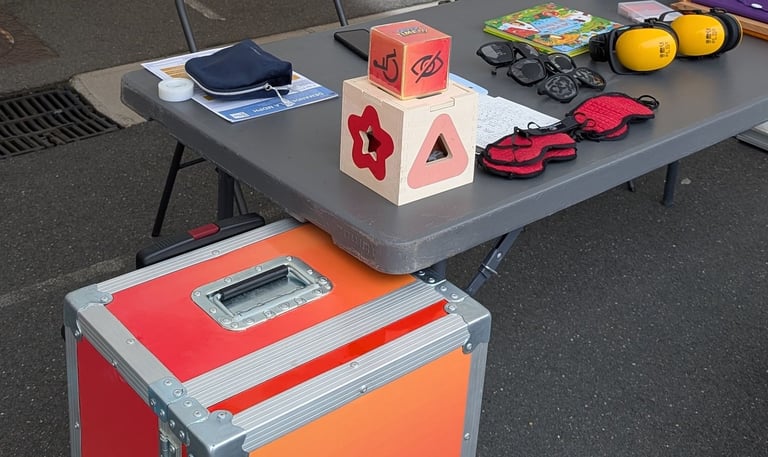Une mise en situation pour expérimenter les défis quotidiens que rencontrent les personnes en situation de handicap (découverte du braille, écouter avec une audition réduite, faire des actions du quotidien avec une invalidité motrice, reconnaître des objets avec le toucher). Un retour sur la situation vécue, et sur les solutions disponibles en matière d'accessibilité.
